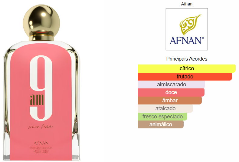 9am Pour Femme da Afnan é uma celebração olfativa da energia, do foco e da elegância diurna. Projetado para a mulher que busca uma assinatura olfativa que transmita limpeza, sofisticação e vitalidade, esta fragrância abre com uma explosão revigorante de cítricos nobres. A evolução revela um coração suculento e feminino, onde o doce natural da framboesa equilibra a acidez refinada da groselha, criando uma aura de “banho tomado” com um toque de luxo.